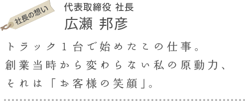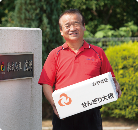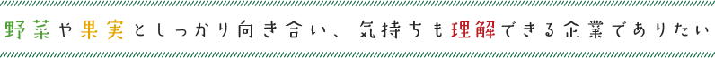 私が最も大切にしているのは、「人との繋がり」です。誠意を持ってお客様に接し、心から相手のためになる情報をお伝えすることが、信頼関係につながる第一歩だと考えています。我が社のモットーは、「頼んだら、必ず有る」。地域に根差した企業ならではのネットワークを生かし、お客様からのオーダーにお応えできるよう努めています。その原動力となるのが、「お客様の笑顔」。創業当時は、トラックであぜ道を運転しながら青果物を届けていた時代で、小さな店主のおじいちゃんおばあちゃんたちからもらった「ありがとう」の言葉と笑顔が私の原点であり、今も心に息づいています。これからも私たちを待って下さるお客様のために、ずっと走り続けます。